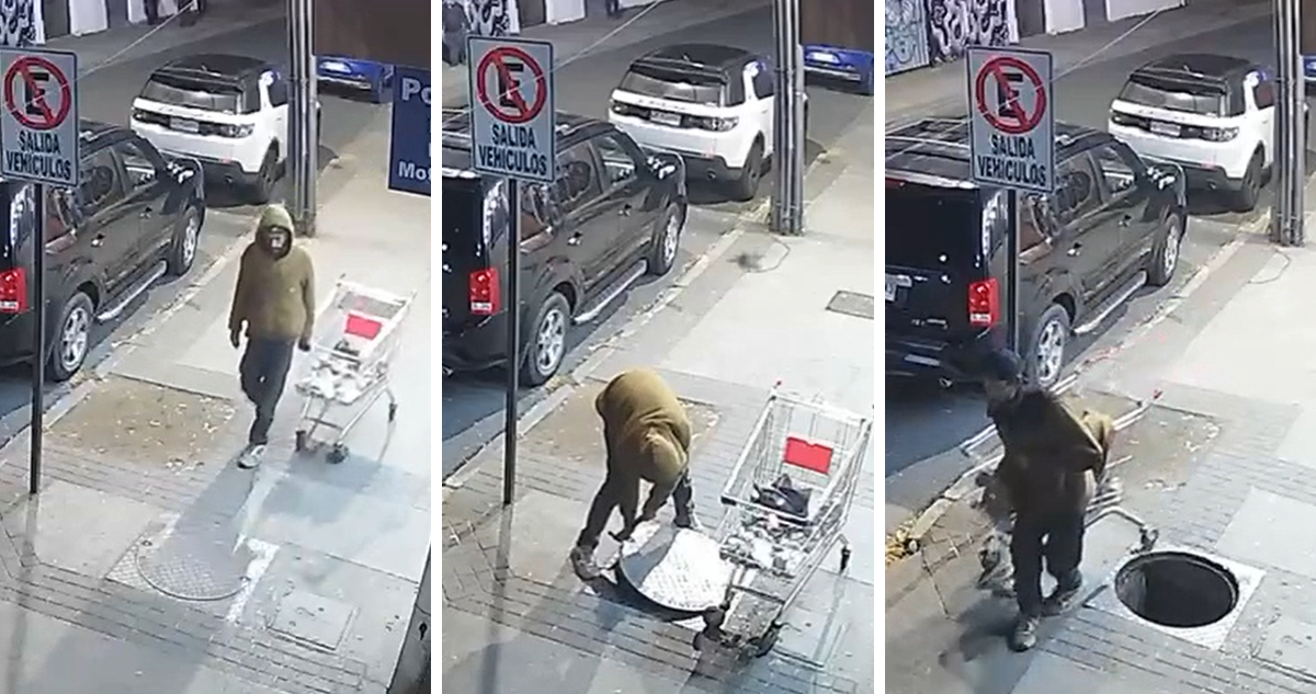 Posteriormente, carga la tapa en el carro, la cubre con un polerón y se retira sin dejar señales evidentes del robo.